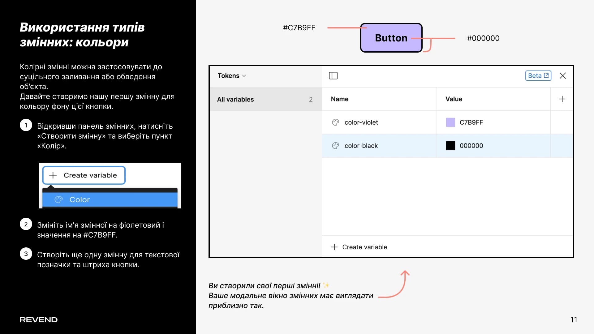 На презентації команда UX/UI ділиться своїм досвідом та експериментує з створенням першої змінної для кольору фону кнопки. Колірні змінні можуть ефективно використовуватися для налаштування заливки або контуру об’єкта у дизайні.